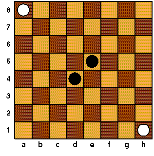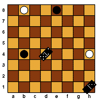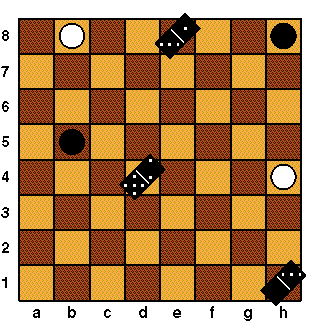 The board is considered to "wrap around" at the edges. That is, a piece that moves off one edge re-enters immediately at the opposite edge. (For instance, if the piece at h1 moves to the right it moves to a1.) Thus the starting position is symmetric between White and Black.